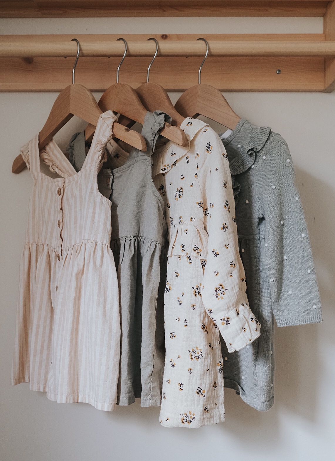 Now that we’re nearing toddlerhood, we were in desperate need of some new clothes for the colder weather. But I have to be really intentional about it, otherwise, it could get away from me really quick. So I looked at what summer dresses could work with tights and an undershirt, and only allowed myself to purchase new things within a budget or while they were on sale. I also made sure that most things could be mixed and matched. Almost everything is from H&M, Quincy Mae, Old Navy, and Colored Organics.